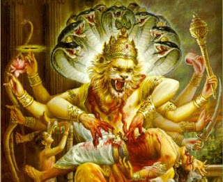 Half lion-half man avatar. Demon king Hiranyakashipu becomes enormously powerful, gains special powers by which no man or animal could kill him, then bullies and persecutes people who disagree with him, including his own son. The Man-Lion avatar creatively defeats those special powers, kills Hiranyakashipu, and rescues demon's son Prahlada who opposes his own father. The legend is a part of the Hindu festival Holi folklore.